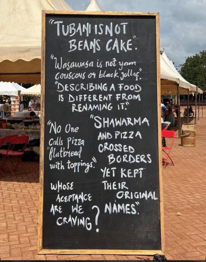 A thought-provoking signboard boldly declaring “Tubani is not beans cake” is currently causing a stir on social media, igniting conversations about the importance of preserving African food identities.